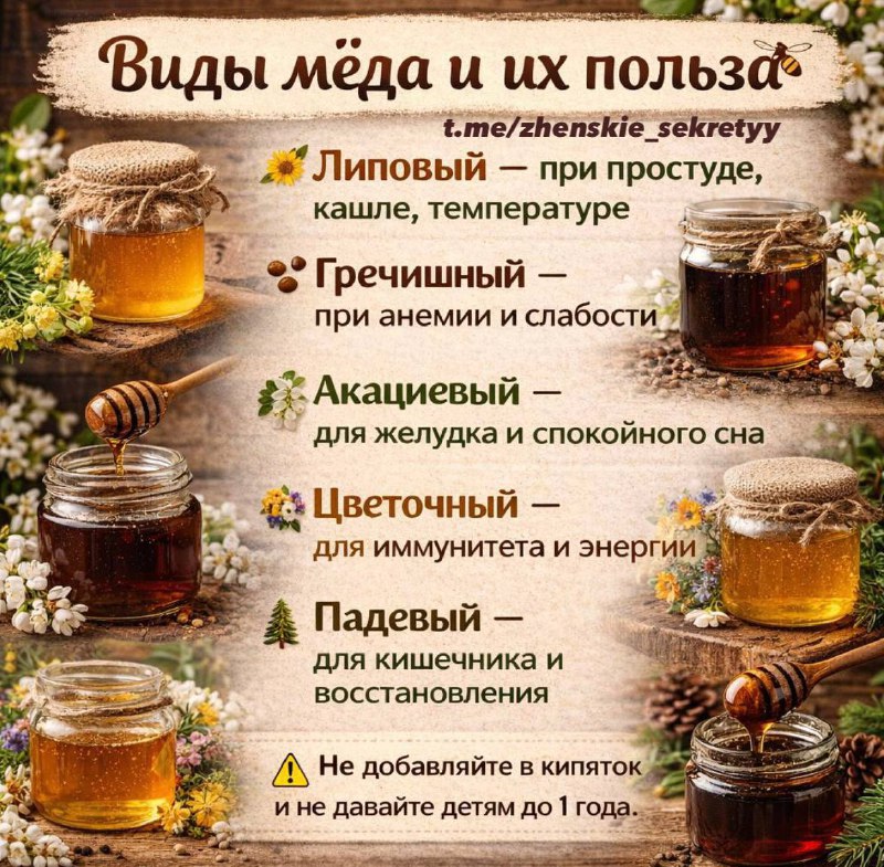 Виды мёда и чем они полезны. 1. Липовый мёд Помогает при: простуде и кашле, боли в горле, температуре. ✔ Обладает выраженным противовоспалительным и потогонным эффектом. Идеален в тёплом чае при ОРВИ