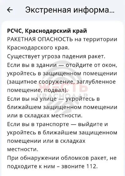❗️Ракетная опасность объявлена в Краснодарском крае UPD: отбой опасности. Не грузит кадры? Смотри тут👇 https://max.ru/zhest_krasnodar123