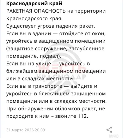 ❗️Ракетная опасность объявлена на территории Краснодарского края, — сообщили в РСЧС Рекомендуется находиться в укрытии до получения сигнала «Отбой». Не грузит кадры? Смотри тут👇 https://max.ru/z