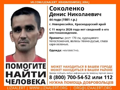 Внимание! Пропал человек! Соколенко Денис Николаевич, 44 года (1981 г.р.), г. Новороссийск, Краснодарский край. С 11 марта 2026 года нет сведений о его местонахождении. Приметы: рост 170 см, худощав