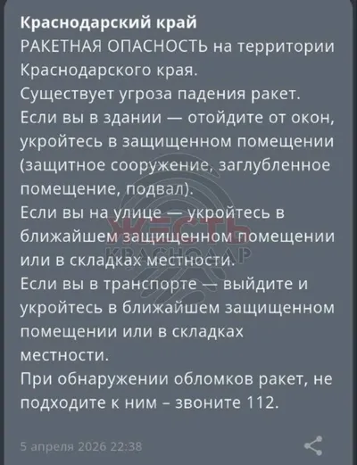 ❗️«Ракетная опасность» объявлена на Кубани Об этом информирует центр оповещения края. UPD: отбой ракетной опасности. Не грузит кадры? Смотри тут👇 https://max.ru/zhest_krasnodar123