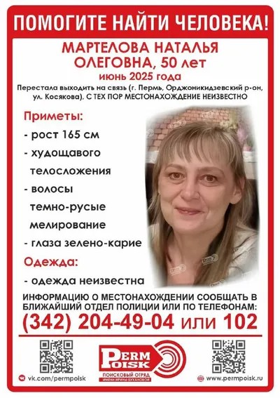 Найдена пермячка, которая считалась без вести пропавшей, — волонтёры. 50-летняя Наталья Мартелова ушла из дома и пропала в апреле 2025 года. Где была женщина — не уточняется. ▫️ Жесть Пермь — подпис