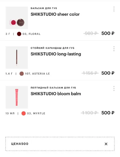 Все по 500 - в ЗЯ проходит промокод на некоторые продукты Shik 😍 Из новой коллекции на румяна к сожалению не прошел, но зато на карандаш и бальзам да 🙌🏼