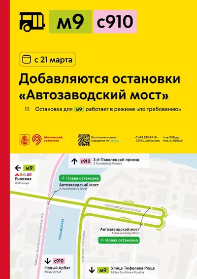 С 21 марта для маршрутов м9 и с910 добавляются остановки «Автозаводский мост». У маршрута м9 остановка будет работать в режиме «по требованию».
