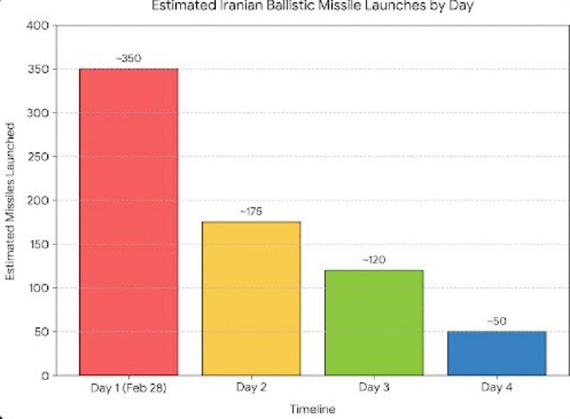 Картина запуска Ираном ракет по дням. Мы видим, что с каждым днем запусков все меньше. Несмотря на браваду иранцев, видимо ракеты плохих людей тоже их достигают, и в том числе поражают ракетные уст