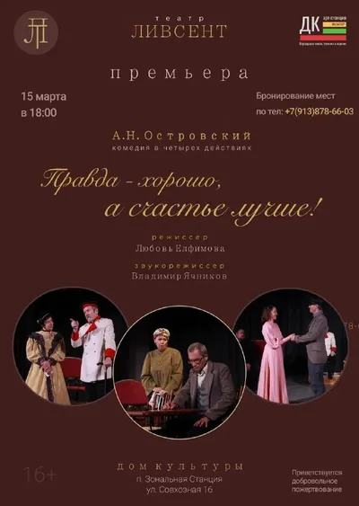 15 марта, воскресенье, в 18.00 окунитесь в культурную жизнь. Приходите с друзьями, чтобы зарядиться энергией и драйвом актеров. Зональненский театр "ЛИВСЕНТ" приглашает на спектакль "Правда хорошо, а