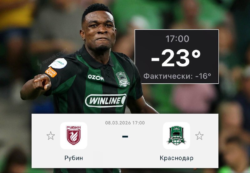 ⚡️ «Краснодар» не хочет лететь на матч с «Рубином» из-за морозов в Казани: «быки» требуют перенести игру на другой день, потому что в Татарстане завтра ожидается в районе –15°C. Это температура, ниже