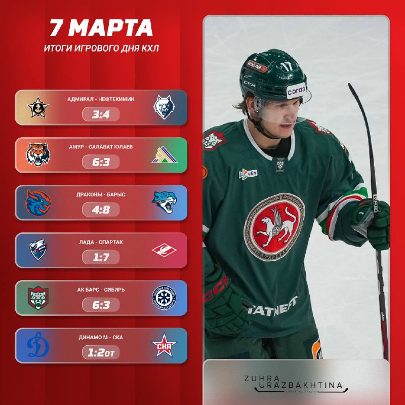 Итоги дня с Зухрой 🏒 - СКА в овертайме обыграл московское Динамо 2:1. У Плотникова ассистентский дубль в 1000 матче. - Ак Барс победил Сибирь 6:3. Хет-трик у Барабанова. Дубль у Семенова. - Спарта